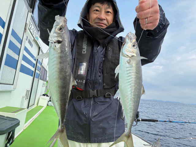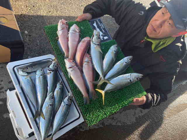 アジ | 22〜38 | 1〜22 | 瀬の海96m 他に、サバ ビギナーさん多数で出船! ウワ潮に流れ有り、タナ取りなど難易度有りながらも、コツを掴んだ方からポツポツとゲット出来ました!! サイズは混じくりながらも、良型が目立ったような感じでした!! リレー船の為、希望により10時半までの釣果 |