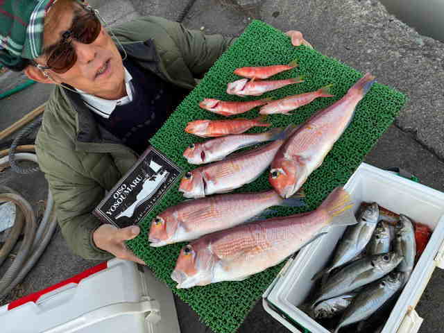 アマダイ | 20〜54 | 1〜 9 | 大磯沖60〜115m 他、アマダイ49cm×1匹・42cm×1匹 41cm×1匹・40cm×2匹 38cm×1匹など、良型多数!! 他に、イトヨリ・ヒメコダイ・キダイ・小アラ・アジ |