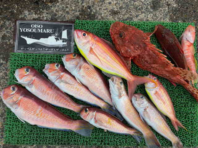 大磯沖50〜98m 他に、ヒメコダイ・イトヨリ・ホウボウ・カナガシラ・ヒメジ・ユメカサゴ・クルマダイ マジの小型はほぼ混じらず30cm超級が目立ってゲット出来ました!! リレー船の為、10時10分までの釣果 |