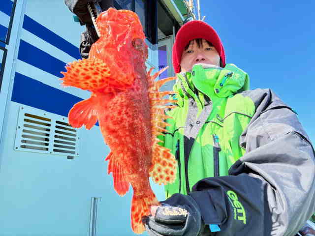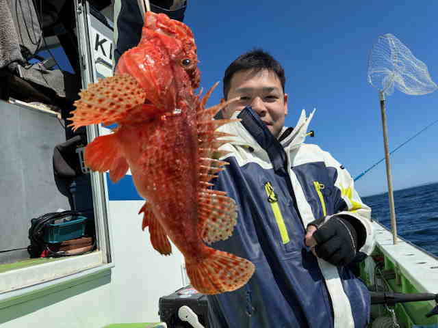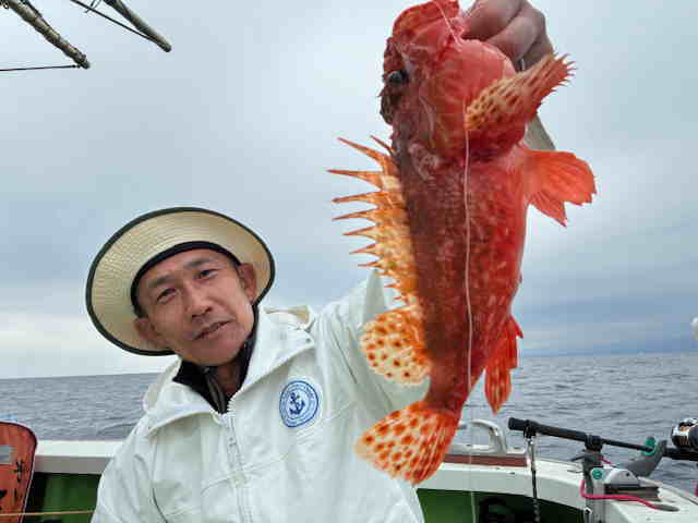 | オニカサゴ | 27〜44 | 0〜 3 | 瀬の海107〜145m 左記オニカサゴの内 44cm×1匹・38cm×1匹 他に、ユメカサゴ・ウッカリカサゴ・ワニゴチ やはり高級魚!当たり数は少な目でしたが、お陰様で中型〜良型がちらほら上がってくれました!! その中で大オニ退治成功!44cmは1.3kgの品物もゲット出来ました!! リレー船の為、10時15分からの釣果 |