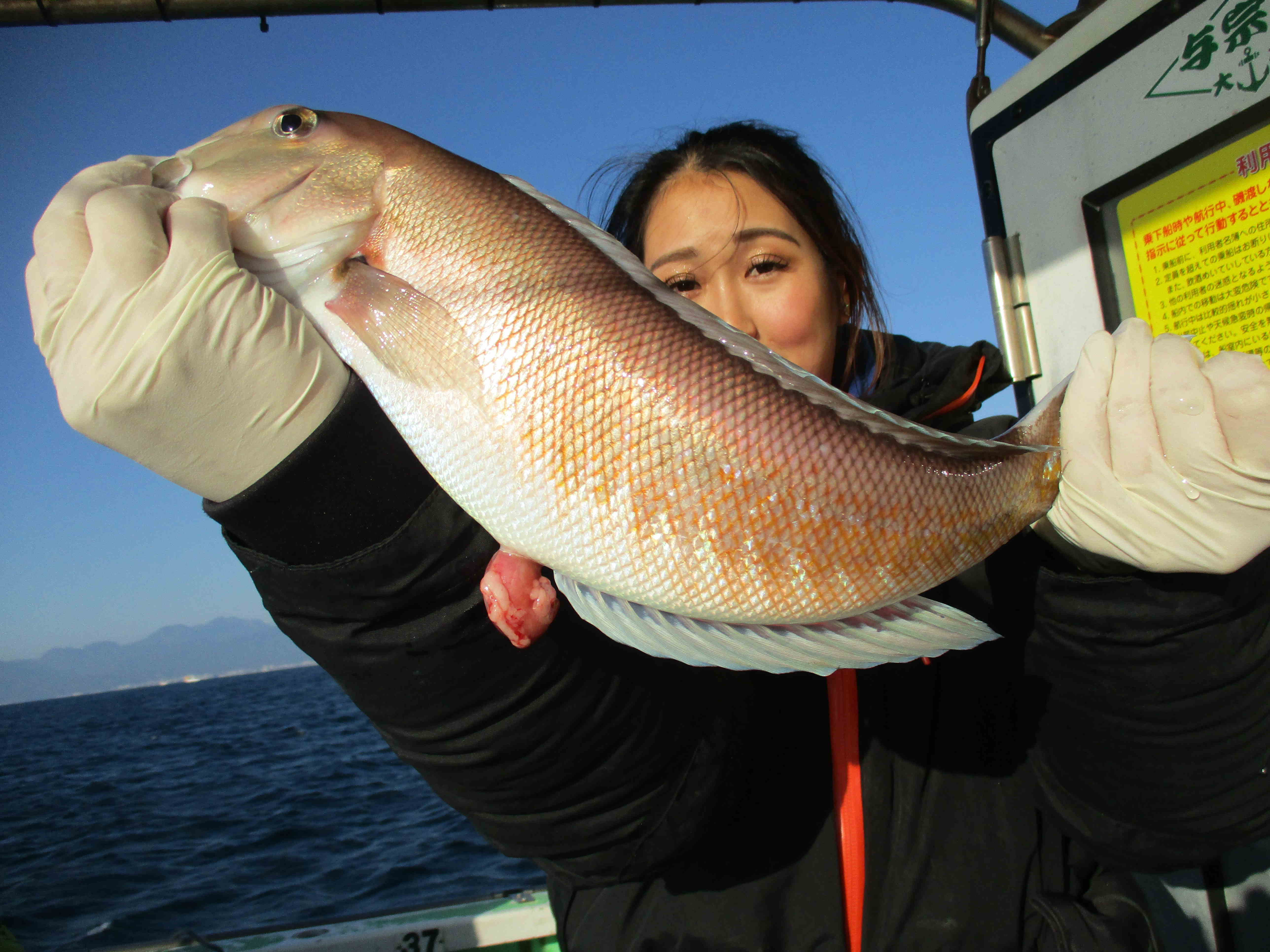 アカアマダイ | 22〜47 | 1〜 8 | 大磯沖55〜100m 左記アカアマダイの内 43cm×1匹・42cm×1匹 他、イトヨリ・ヒメコダイ 良型ゲット出来ました!! 当たりっぷりは釣りガールに軍配ありか!? |
