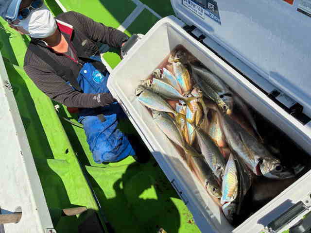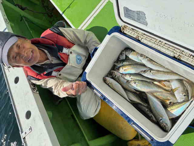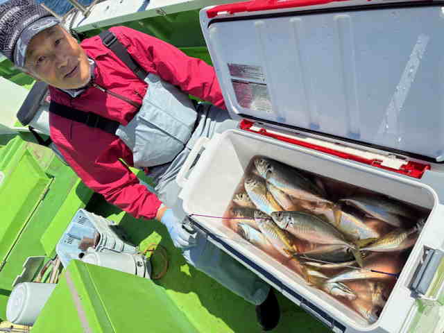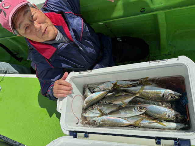 アジ | 22〜37 | 24〜45 | 瀬の海95〜100m 他に、サバ 朝イチ、当たり遠く焦りの立ち上がりも、段々と喰い盛り上がり、順調な当たりっぷりに!! 後半は潮流れが速くなり難易度有りながらも、丁寧なタナ取り等で追加出来ていました!! |